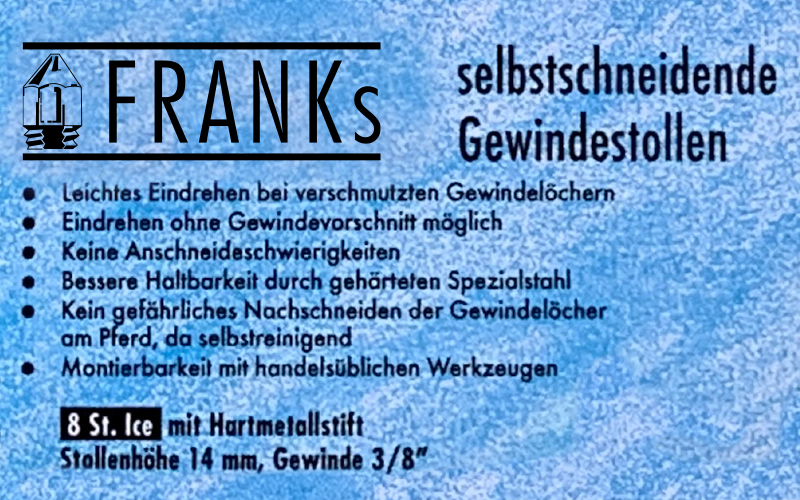 Die Auswahl des Stollens hängt in erster Linie vom Geläuf ab. Unser Franks Stollensortiment bietet für jeden Boden den optimalen Stollen. Im Allgemeinen werden Stollen vor allem auf Rasenplätzen eingesetzt. Der Reiter prüft auf dem Turnier vor Ort die Bodenverhältnisse, um dann über Länge und Form des Stollens zu entscheiden.