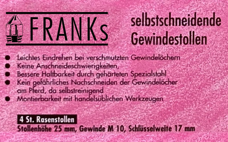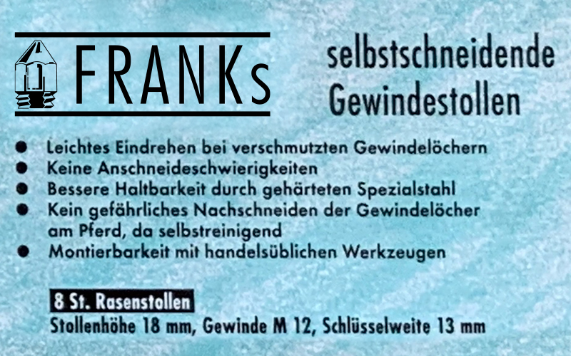 In solchen Fällen hat sich der Franks Rasenstollen über Jahre bestens bewährt. Aus veterinärmedizinischer Sicht ist es unerlässlich den Stollen sehr sorgfältig auszuwählen. Er soll dem Pferd beim Absprung ausreichend Halt geben und gleichzeitig in der Landung nicht zu sehr abbremsen, um die Gelenke des Pferdes nicht unnötig zu belasten.